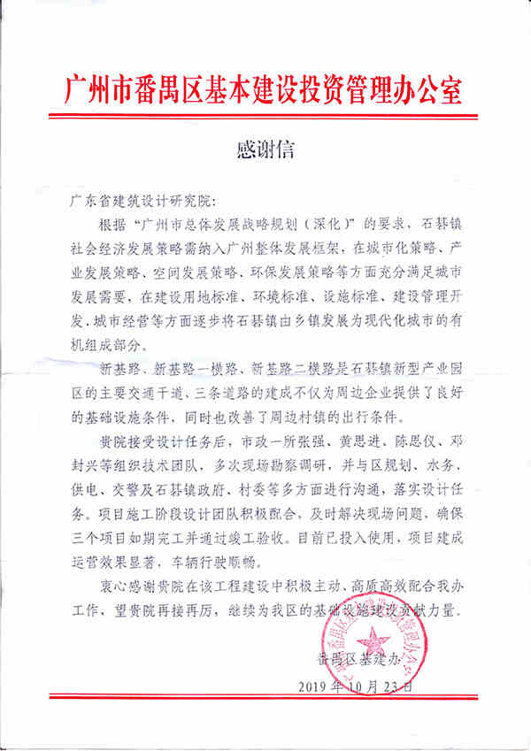 近日,我院市政一所、機(jī)電三所、深圳分院、南沙分院等部門相繼收到業(yè)主感謝信。信中,業(yè)主對我院設(shè)計(jì)團(tuán)隊(duì)的精細(xì)化設(shè)計(jì)和專業(yè)技術(shù)服務(wù)給予了高度評價(jià)和肯定。
