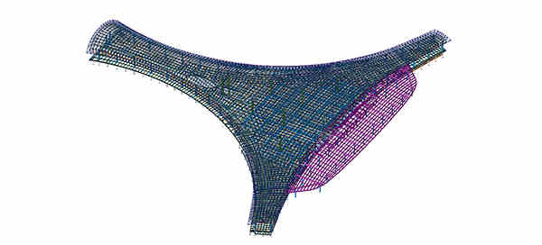 航站樓屋蓋采用正放四角錐網(wǎng)架結(jié)構(gòu),網(wǎng)架最大跨度約54m,最大懸挑距離15m,屋面標(biāo)高從17~38m自由漸變。大跨度屋蓋網(wǎng)架屋面覆蓋面積約35300㎡,所有鋼結(jié)構(gòu)用鋼量約5000噸。
