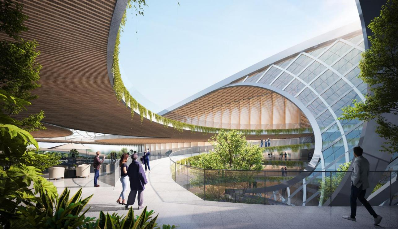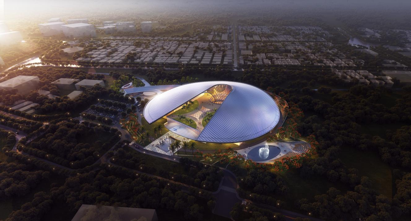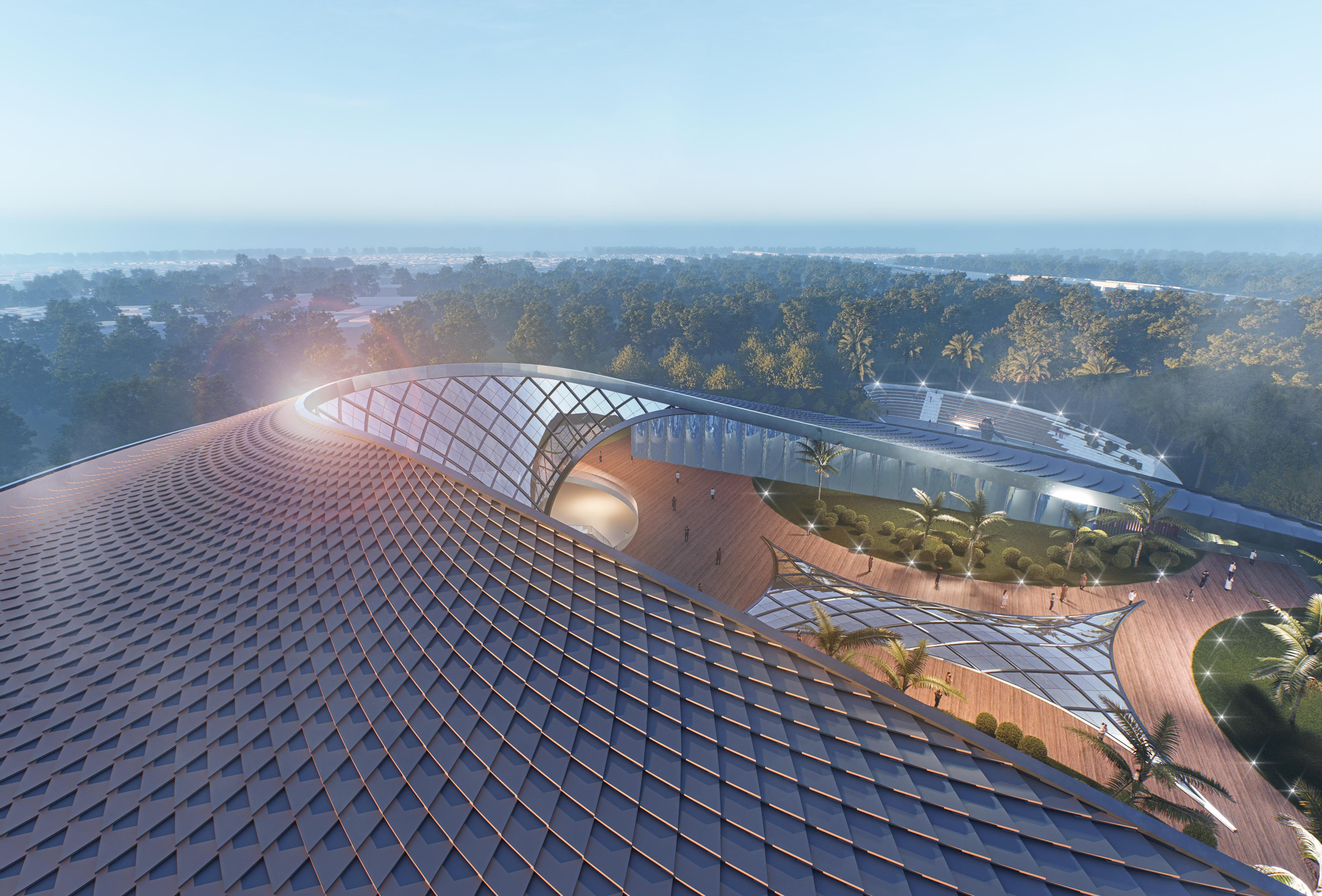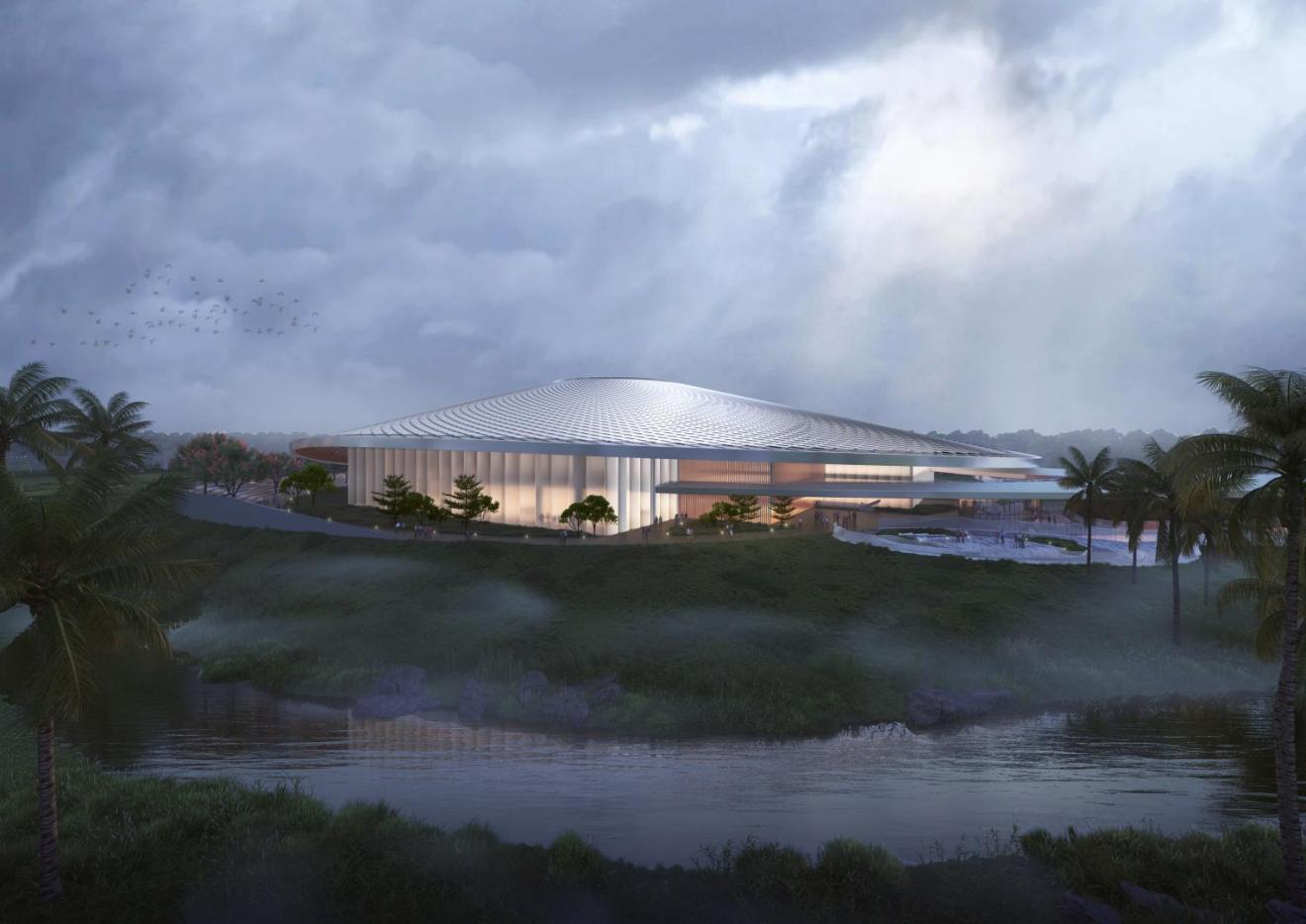 薩爾瓦多坐落于中美洲北部海濱地區(qū),山地、高原和火山遍布,地形錯綜復雜。設計團隊立足國際視野與本土精髓,深刻提煉薩爾瓦多海洋元素,將設計理念定為“海貝明珠”,象征其為太平洋中的一顆璀璨明珠。建筑整體形態(tài)宛如海中扇貝,屋頂設計借鑒中式瓦片風格,力求營造出動態(tài)光影效果,彰顯著中薩兩國深厚友誼。設計方案巧妙融入“克萊因瓶”理念,以中庭為樞紐,實現(xiàn)內(nèi)外景觀的相互滲透與融合,打破空間界限,讓自然景致無縫延伸至室內(nèi),提升整體空間品質(zhì)。同時,設計積極采用綠色低碳技術,大幅降低建筑能耗,成功營造出既舒適低碳又面向未來的空間環(huán)境。